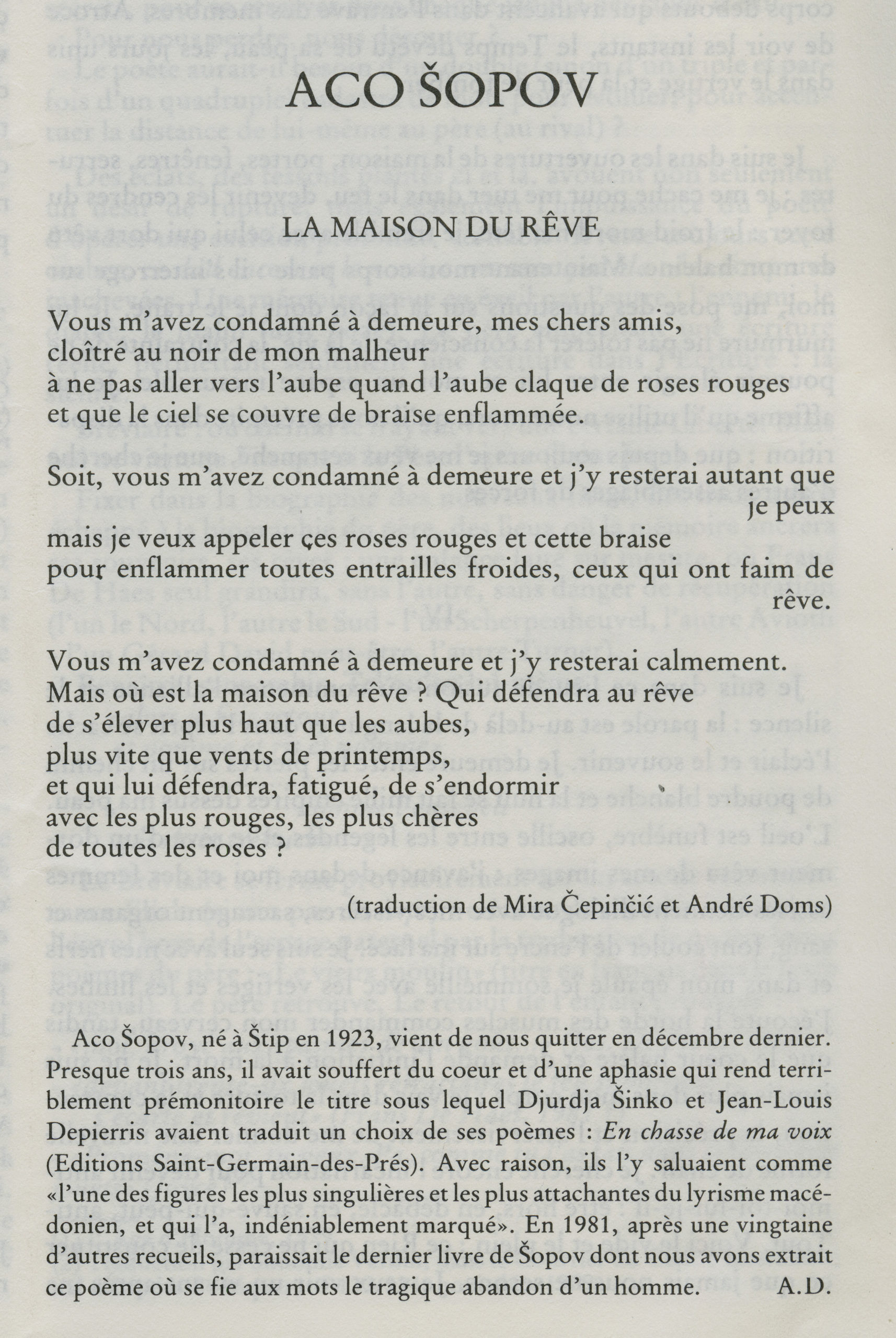 Traduit par Jasmina Šopova et Édouard J. MaunickAnthologie personnelle, 1994